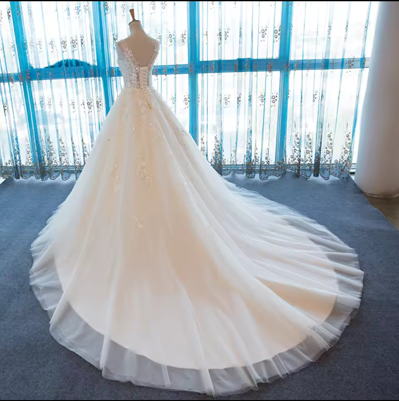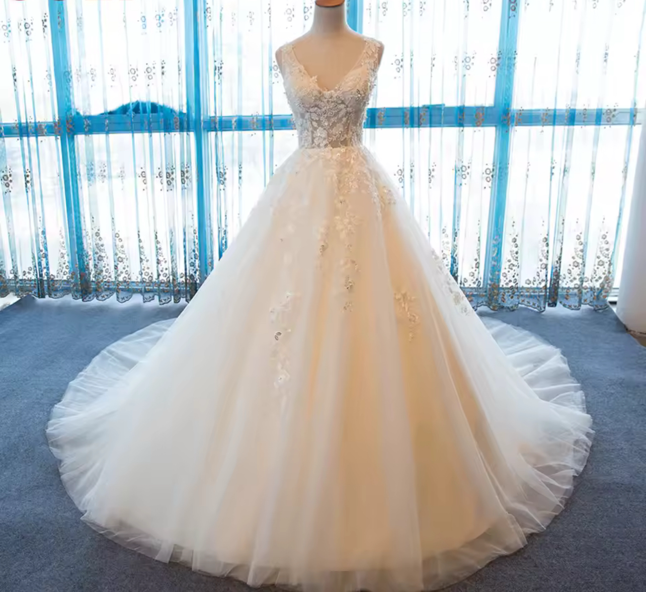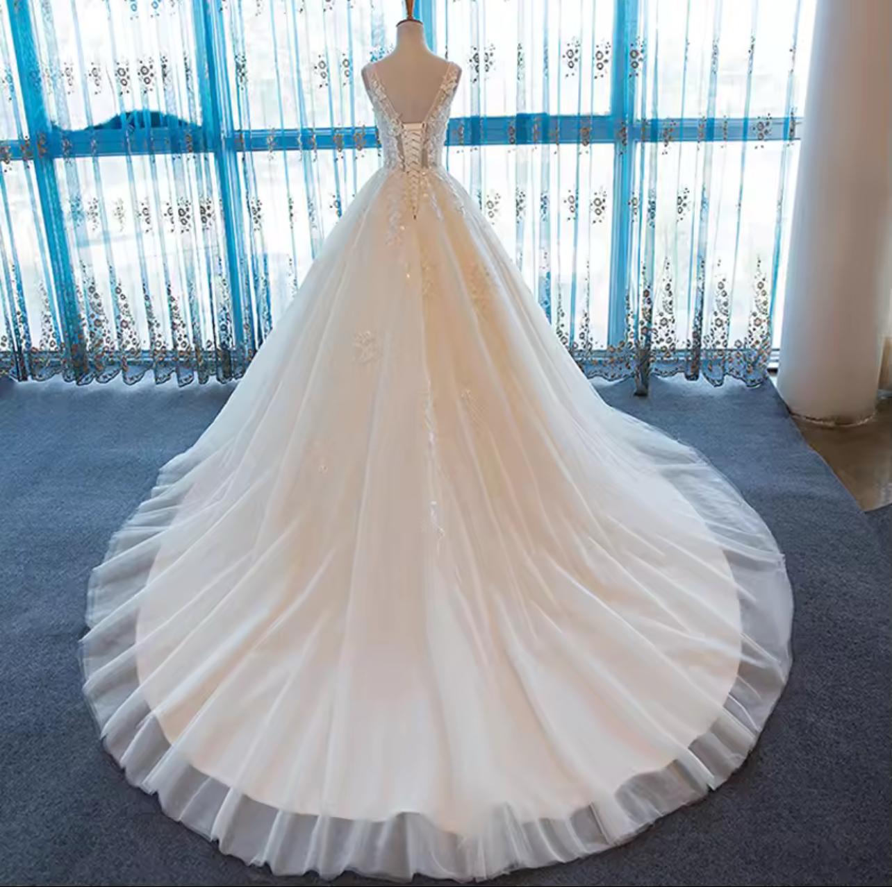Designed to elongate and flatter, this gown is a timeless favorite
