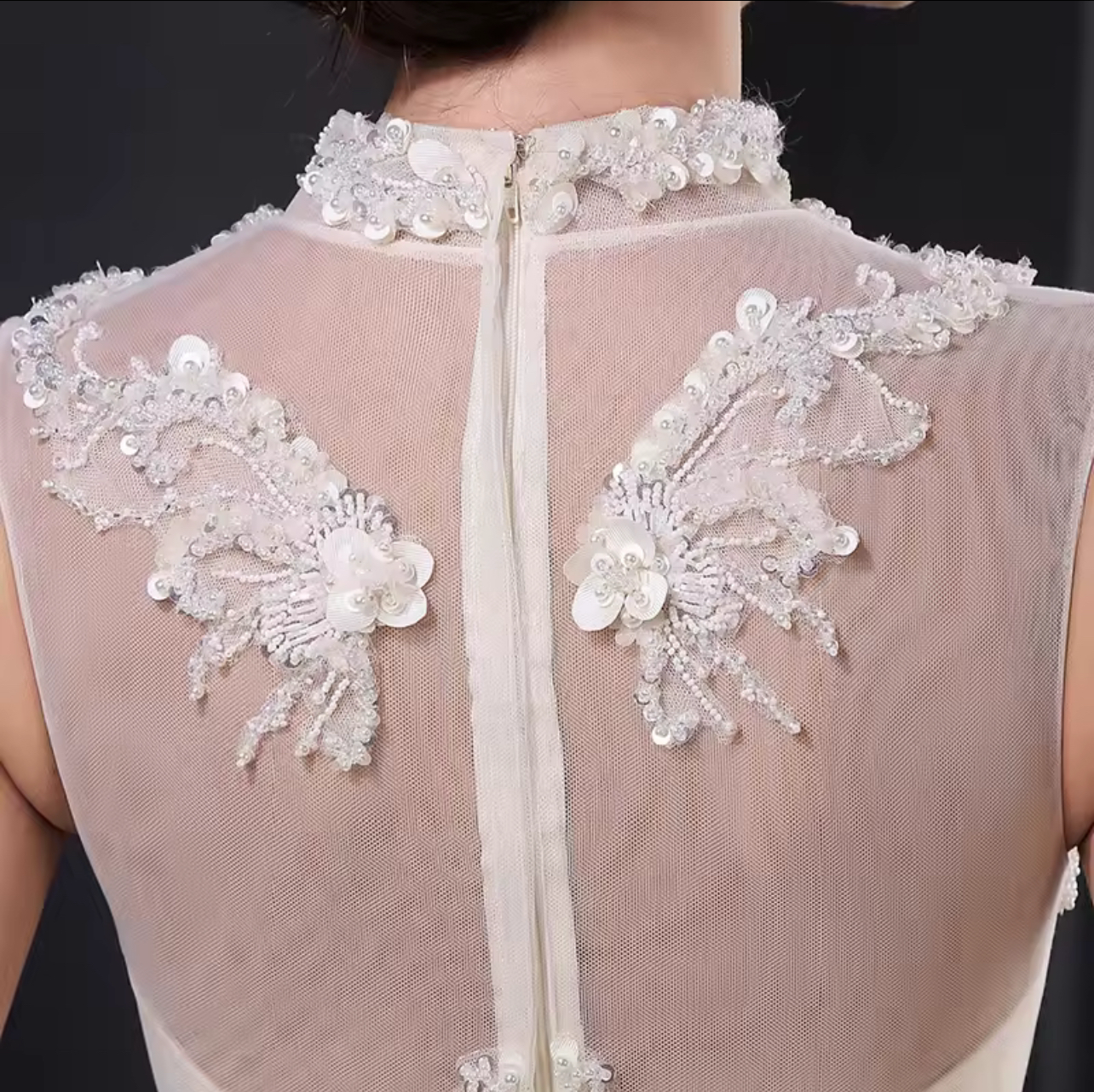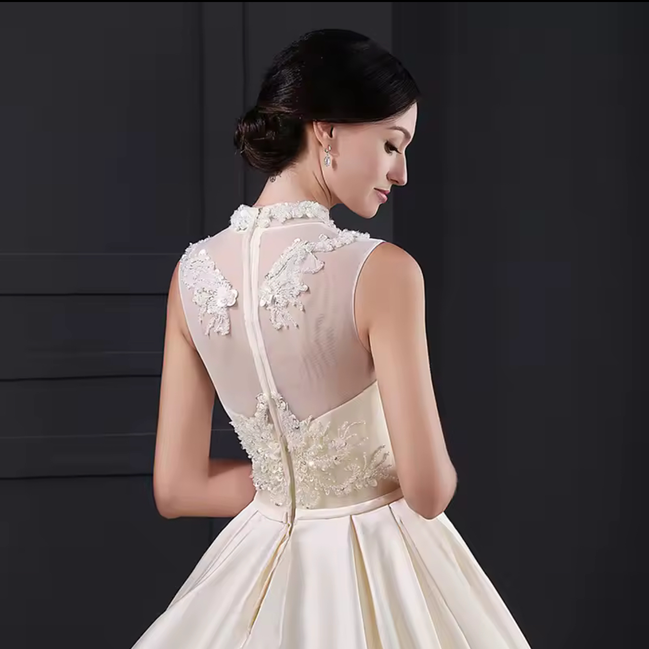Cameron B What a lovely dress! The details on the neck and bodice are amazing. The dress is well structured and comfortable to wear all day, which is nice because my wedding will take all day. I am thinking about adding a belt at the waist but I haven’t made up my mind yet.